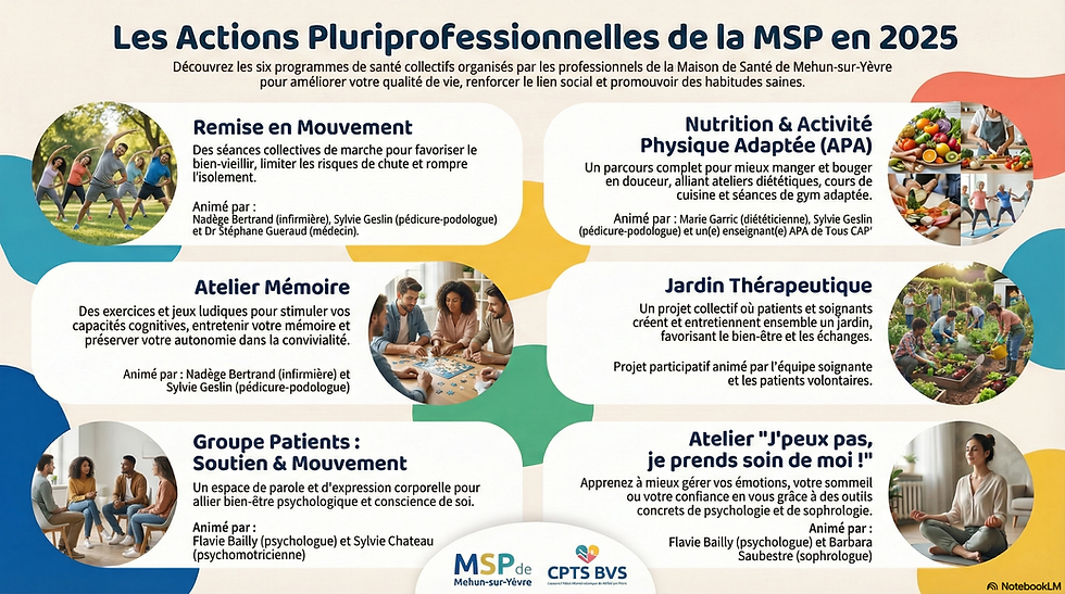 Ces différentes actions témoignent de l'engagement de toute l'équipe pluridisciplinaire de la MSP de Mehun-sur-Yèvre pour une prise en charge complète et humaine de nos patients. Nous sommes convaincus que prendre soin de soi est un acte essentiel, et toute notre équipe est là pour vous accompagner sur ce chemin. N'hésitez pas à vous renseigner davantage sur ces actions qui sont conçues pour vous.